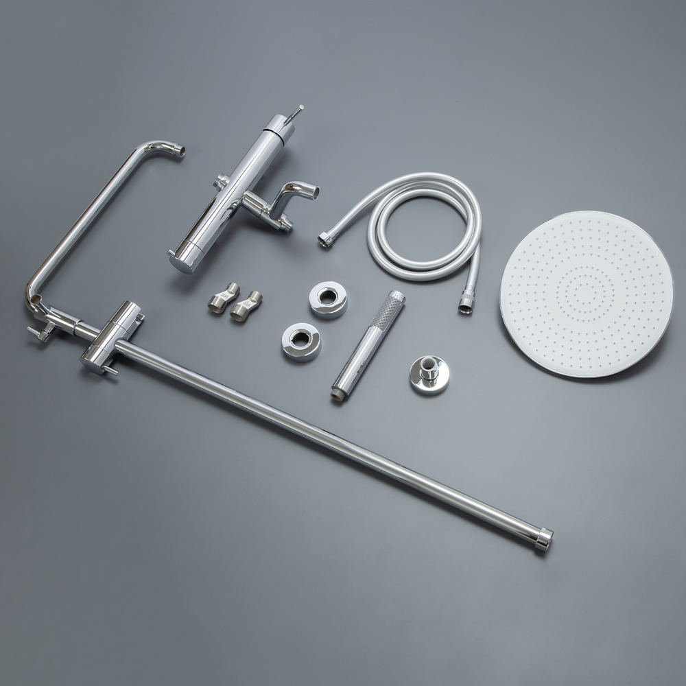душевая стойка; комплект эксцентриков; смеситель; верхний душ; душевой шланг; ручной душ; инструкция.