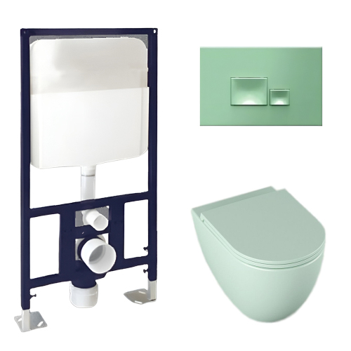 В комплекте: рама; кнопка смыва; унитаз; сиденье; крепеж.