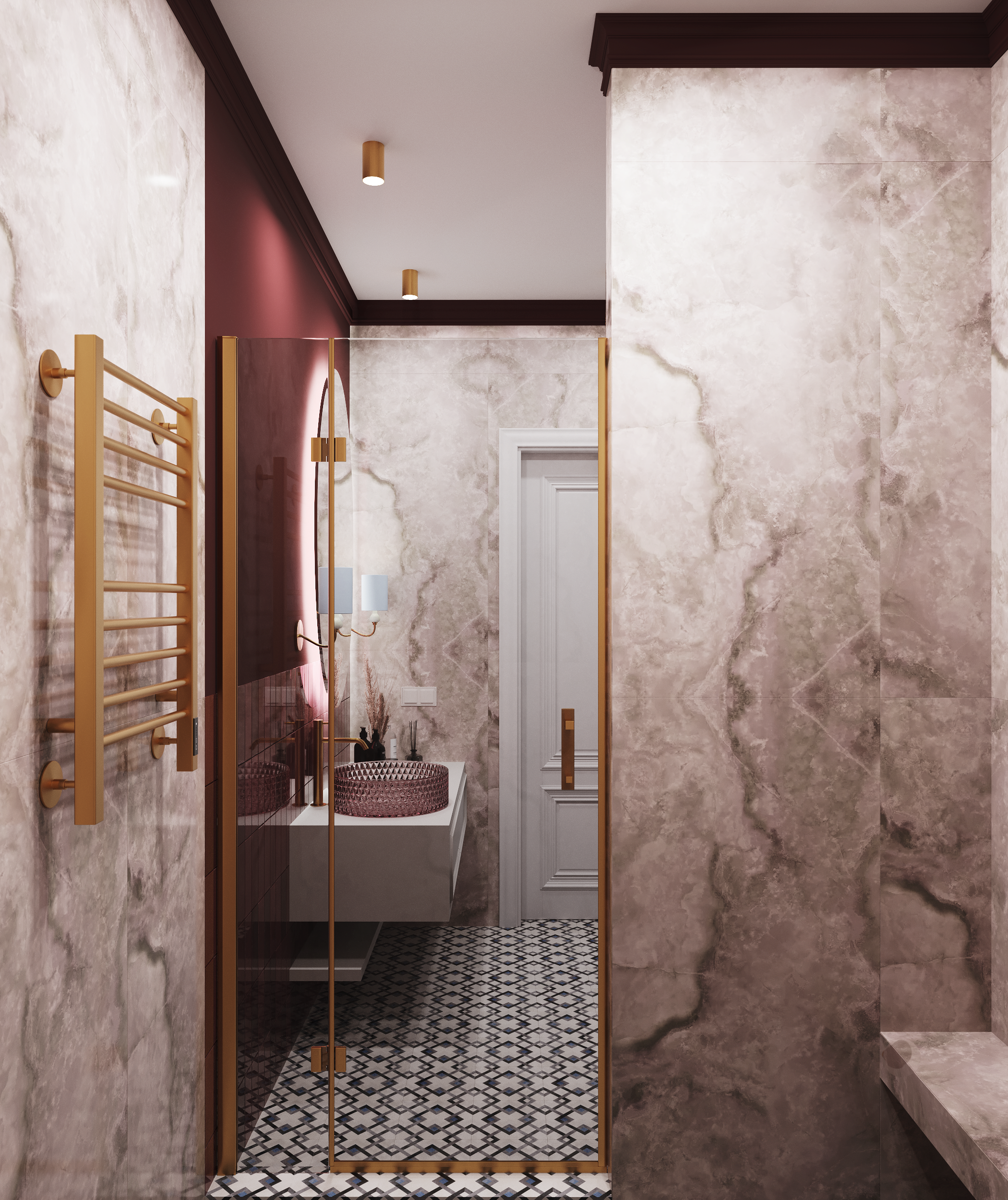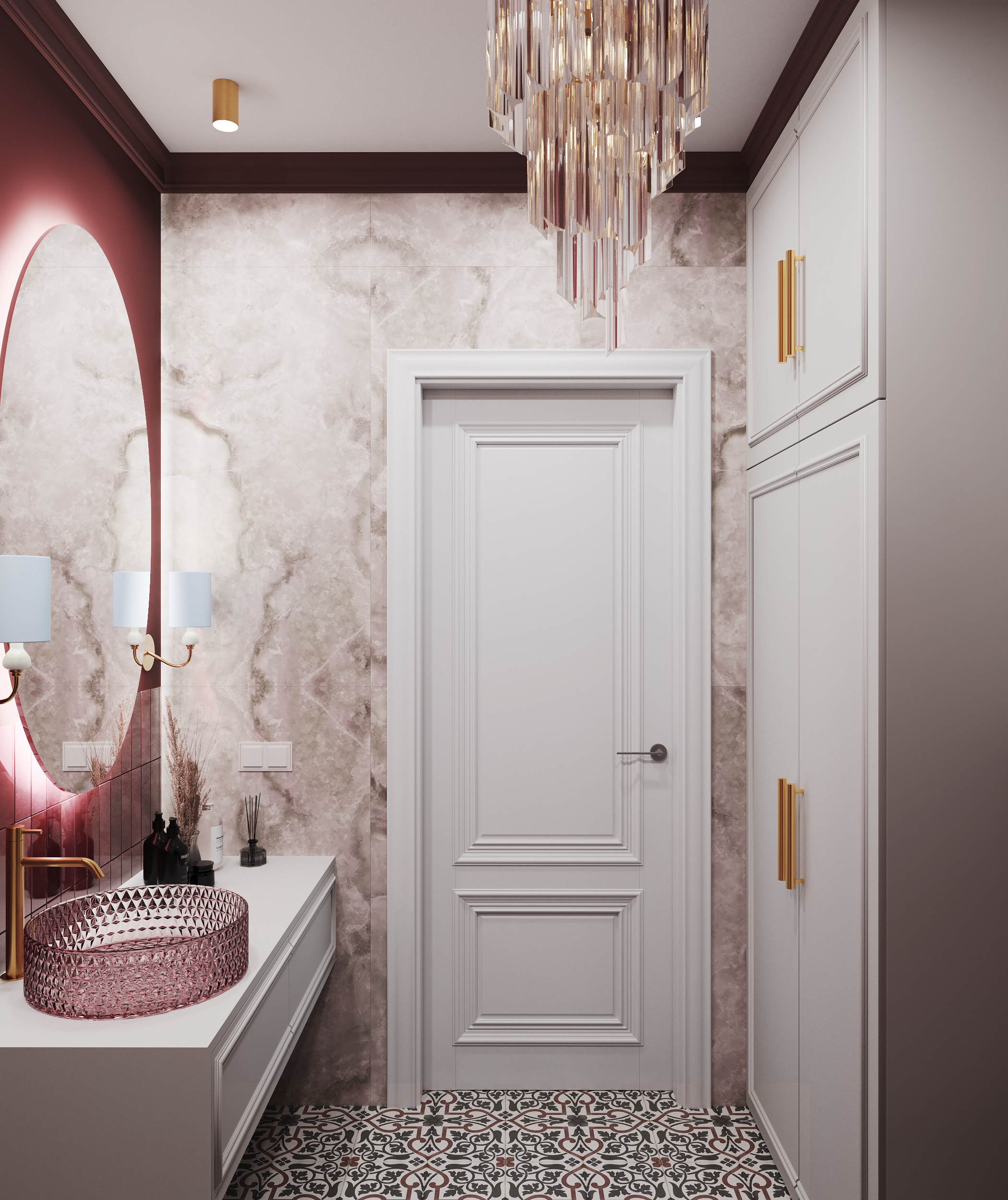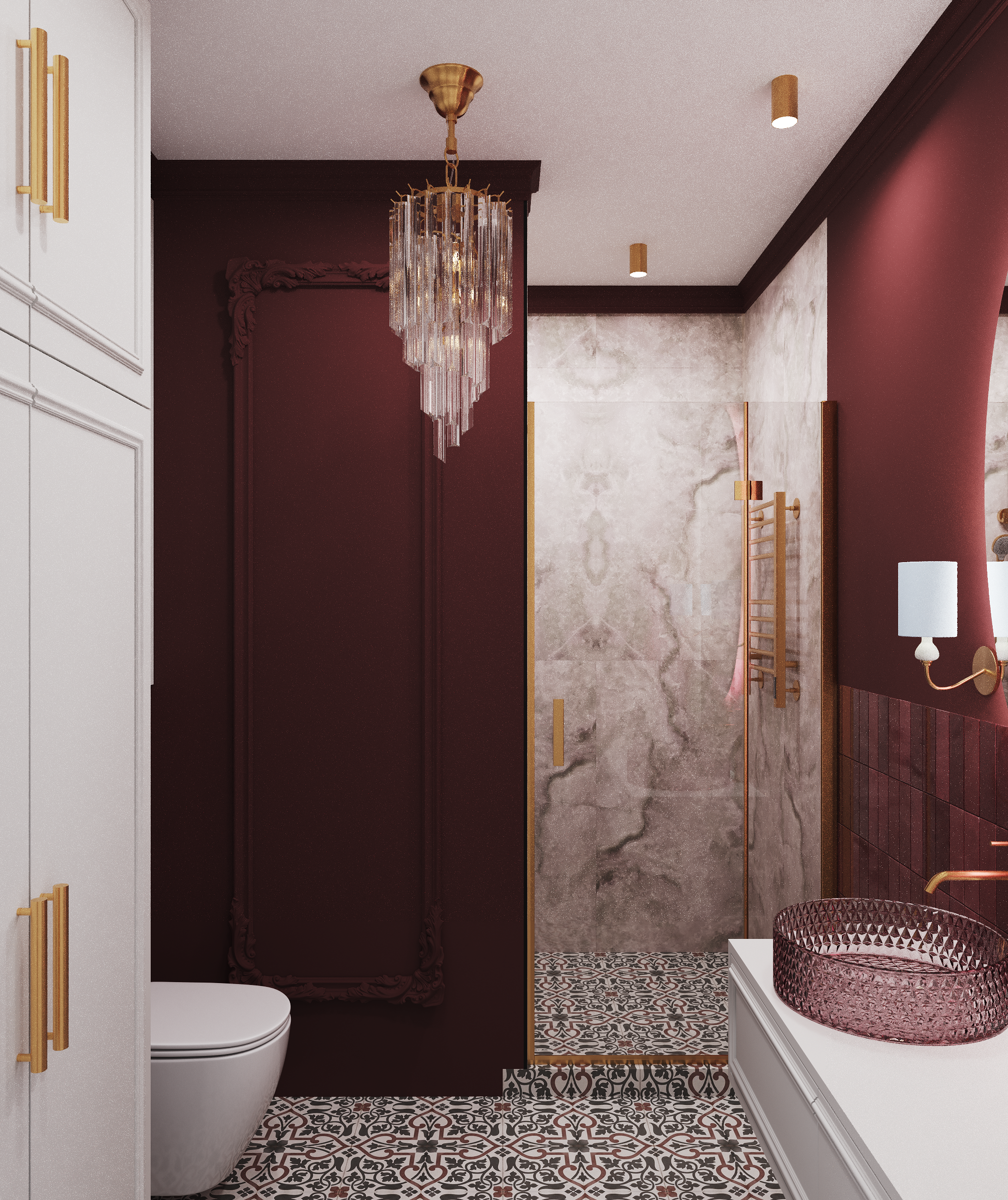 В отличие от ванной, санузел оформлен в более насыщенных бордовых и розовых тонах, создающих атмосферу уютного уединения. Стены в зоне раковины и унитаза выполнены в бордовых цветах - керамогранита и краски, акцент в виде розовой раковины делает пространство теплым и приветливым. Керамогранит на полу также отличается роскошным рисунком, который отлично сочетается с выбранной палитрой.