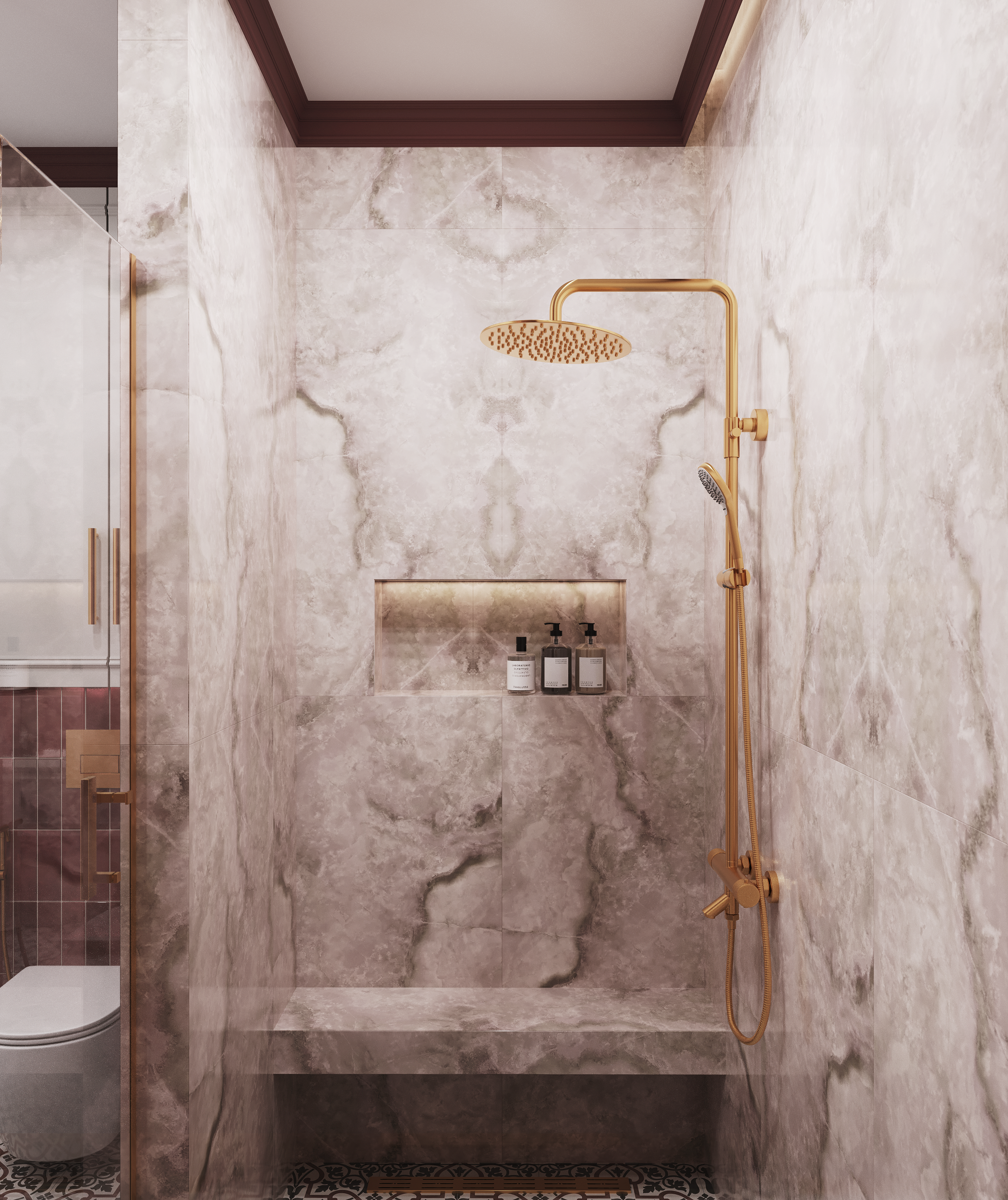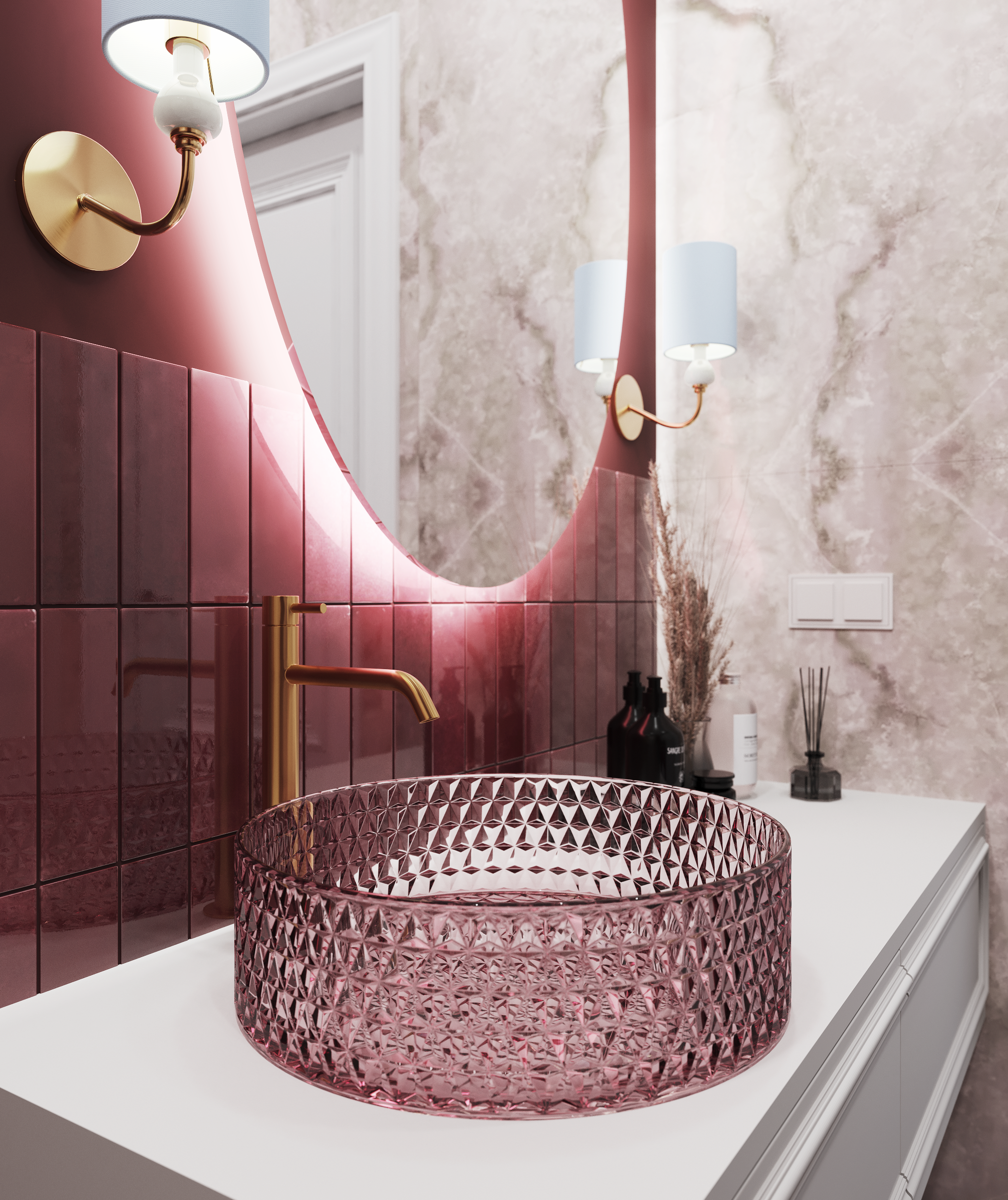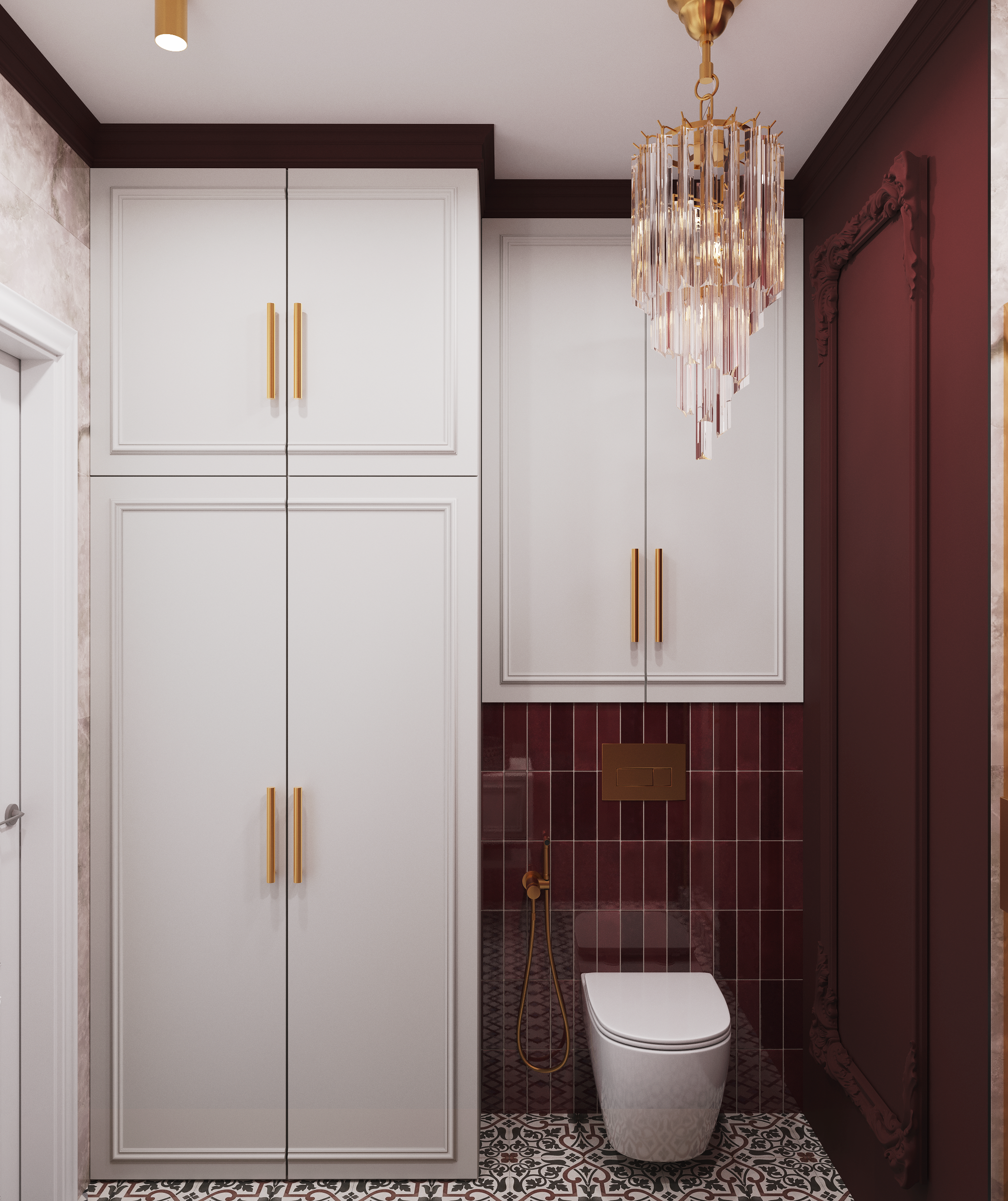 В отличие от ванной, санузел оформлен в более насыщенных бордовых и розовых тонах, создающих атмосферу уютного уединения. Стены в зоне раковины и унитаза выполнены в бордовых цветах - керамогранита и краски, акцент в виде розовой раковины делает пространство теплым и приветливым. Керамогранит на полу также отличается роскошным рисунком, который отлично сочетается с выбранной палитрой.