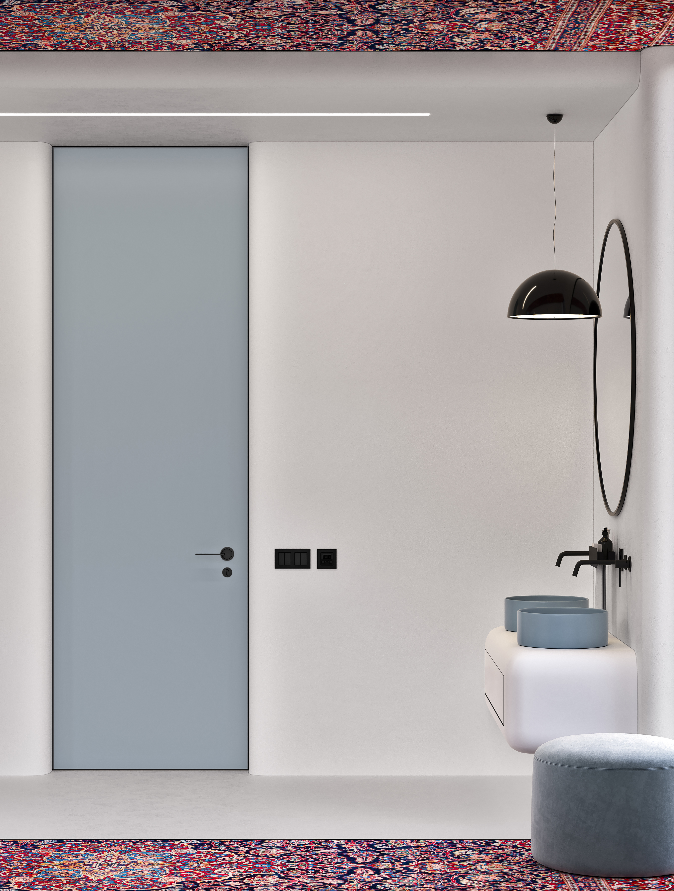 Радиальная форма внешних углов, белый и чёрный цвет в сочетании с яркими, акцентными элементами задают пространству особую атмосферу. В такой ванной можно легко отключиться от внешнего мира и погрузиться в особую атмосферу.